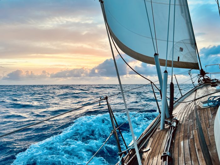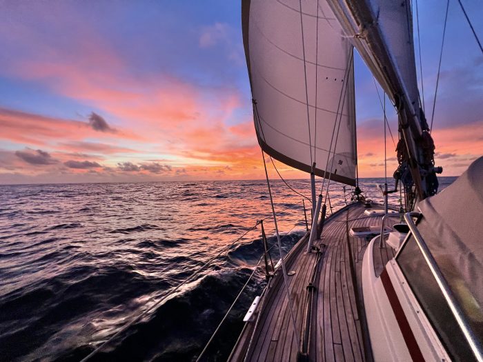 Vi seglar ganska nära kusten (typ 40 nm) och passerar Franska Guyana, Surinam och Guyana. Vattnet är inte längre atlantblått, snarare buteljgrönt och medströmmen gör att vi forsar fram. Här är väldigt många fiskebåtar och de flesta har AIS men det är inte läge att sova på nattpassen. Vi har flera dagar med frisk nordostlig vind och gör god fart. En dag blåser det lätta vindar, knappt segelbart och när vind och vågor inte är överens känns det obalanserat och seglen smäller till då och då. Det blir svårt att sova och för att överhuvudtaget kunna fylla seglen måste vi ändra kurs och seglar inte ens mot mål. Det är frustrerande.