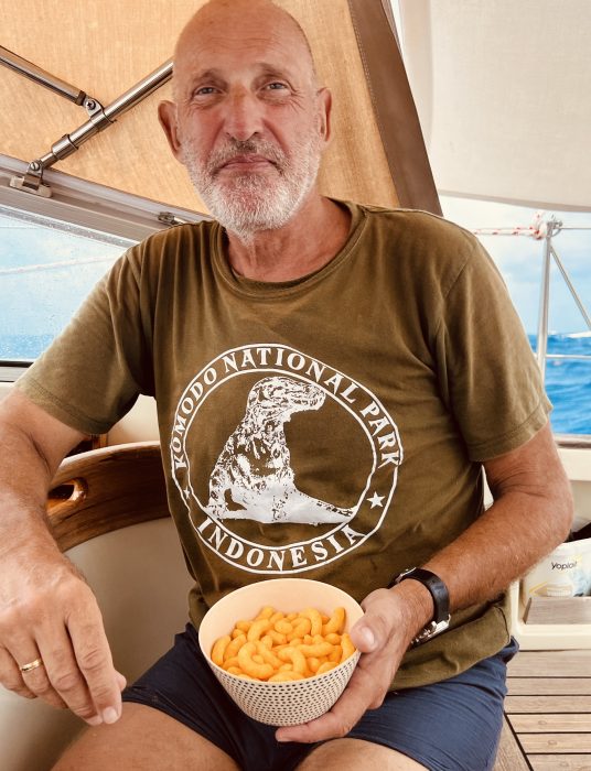 Vakten innebär att befinna sig i sittbrunnen och ha koll på segel, kurs och vindstyrka. Ibland möter vi lastfartyg som dyker upp på AIS:en, vi har larm aktiverat vid risk för kollision. Om allt känns stabilt kan vi ta kortare tupplurer, annars är det ljudböcker eller musik i hörlurarna som sällskap.