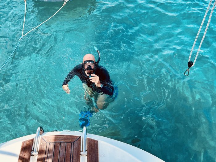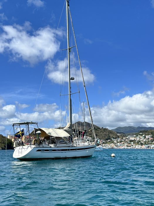 De sista 80 nm från Tobago till Grenada klaras av under natten i ganska lätta vindar. Vi kommer fram till Grenadas huvudstad St George tidigt om morgonen och lägger till vid en mooringboj. På sluttningarna runt staden ser vi färgglada hus, palmer och blommande bouganville. Det blir raskt ett dopp i badbar temperatur (28.5°). Båten ser ganska skabbig ut, med långhalsar och gröna alger. Den ser ut som värsta långseglarbåten. Vi har ju trots allt seglat i nästan sex veckor från Namibia, med det korta stoppet på Fernando, och klarat av över 5000 nm, så lite smuts på ytan får vara förlåtet.