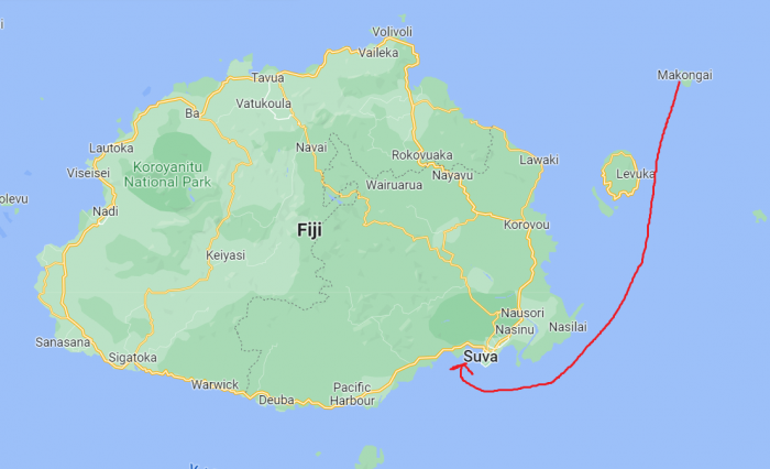 Vi lämnar Makogai samtidigt som solen går ner. Hela dagen har varit mulen och dyster med en del regnskurar. Mentalt är jag inställd på en riktigt skitsegling. När skymningen faller börjar det blixtra på den svarta natthimlen. Vi revar seglen hårt och håller en sydvästlig kurs mot Fijis huvudstad. Under natten passerar några squalls med hård vind och ösregn. När det passerat förbi blåser det inget alls innan vinden stabiliserar sig igen. Så håller det på. Det blir lite rattande hit och dit, men överlag är det inte mycket att gnälla om.
