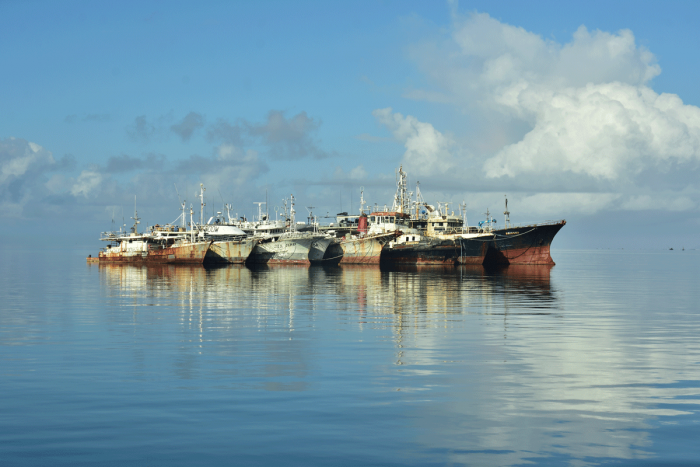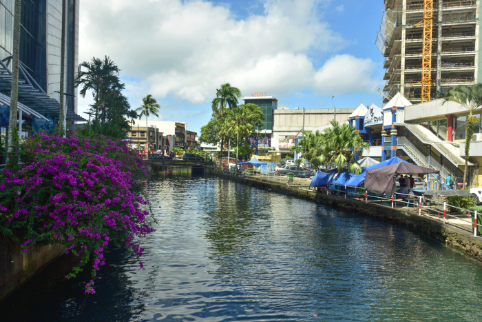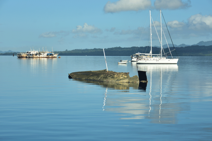 Vi seglar in i Suvas hamn om morgonen och ser oss nyfiket omkring. Det kan vara så att det här är en av de fulast platser vi besökt på vår färd. Vi känner till att det här är en industrihamn, men det är överraskande många rostiga fiskebåtar och containerfartyg. På revet ligger flera gamla vrak och rostar sönder. Staden Suva klättrar på sluttningarna ner mot hamnen och vattnet är brunt och lerigt. Vi kör så långt in i viken vi törs och får till ankringen riktigt bra bredvid ett rostigt skrov. När vi ätit frukost och sovit lite kommer vi ihåg det här med tidvatten. Vi inser att vi ligger ankrade på knappa 3 meter och när tidvattnet ska sjunka undan med minst en meter, känns det inte helt genomtänkt. Vi drar upp ankaret och flyttar ut på lite djupare vatten. Ankringen här har annars dåligt rykte med båtar som draggar kors och tvärs och höga vågor vid sydlig vind. Vi är tacksamma att vindarna är lätta, närmast obefintliga och nordliga.