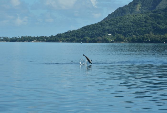 Efter några dagar, när vi tagit ordentligt adjö av Haapiti kommer en liten grupp delfiner förbi och ger oss en avskedsföreställning. Vi tar upp ankaret seglar vidare på vår “farewell-tour” västerut till nästa ö