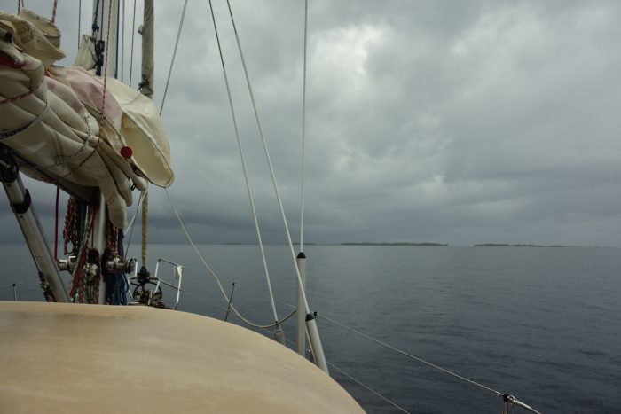 Långsamt förändras vädret med fler och mörkare moln på himlen. På avstånd hörs åskan mullra och så till sist kommer regnet. Fast regn är ett milt uttryck, det är snarare skyfall av bibliska proportioner. Väderfönstret österut är bara ”öppet” några dagar, sen börjar det blåsa friska ostliga vindar igen, så trots regnet bestämmer vi oss för att ge oss av. En portugisisk båt vi pratat med, ska åt samma håll och de går ut genom passet i Tahanea på morgonen. Vi väntat tills eftermiddagens slack och lyckas tajma avfärden med en lätt utåtgående ström, samt ytterligare en störtskur utan dess like. I 12 timmar går vi för motor och nästan lika länge regnar det. Allt blir blött och faktiskt riktigt kallt. Vi gräver fram våra seglarställ ur gömmorna och jag sätter på mig några jättekonstiga stora och klumpiga skodon på fötterna, de kallas visst gummistövlar. Stövlarna har tack och lova klarat sig från att förstöras av värmen och de uppfyller sin funktion förträffligt. Under natten kan vi äntligen hissa segel men färden blir varken stillsam eller stjärnklar. I horisonten lyser med jämna mellanrum stor kornblixtar upp himlen. Då och då kommer squalls med kraftiga vindar och mer regn. Vi går dock med god fart mot mål och det är ju i alla fall något att vara nöjd över.