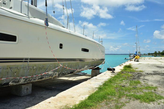 I Hao skiner solen och här ligger redan en båt, som är svensk , ska det visa sig. På land ligger dessutom en stor katamaran som ser rätt tilltufsad ut. Ryktena har redan gått i den franska polynesiska facebookgruppen. Katamaranen draggade i dåligt väder för några veckor sedan, och hamnade på revet inne i atollen. Nu är den bärgad och står på land som en påminnelse om vad som kan hända om man har ganska mycket otur.