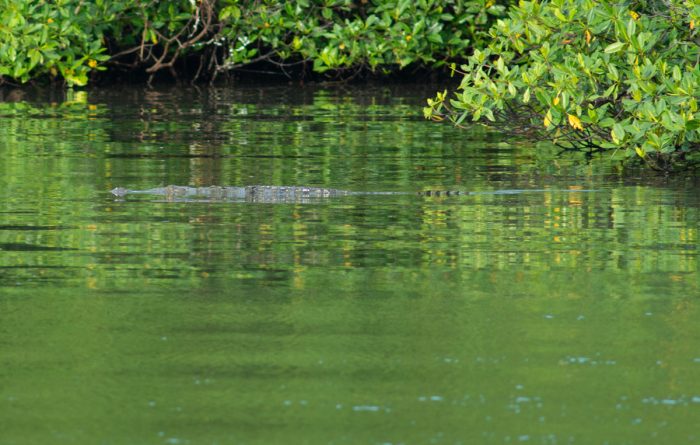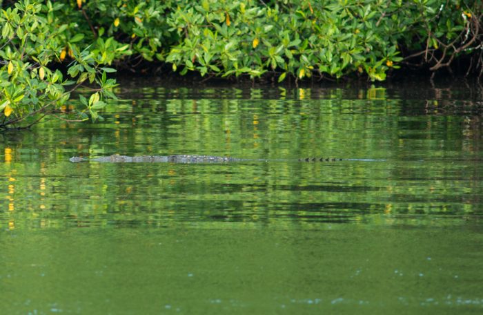 Plötsligt tar Sivert upp kikaren och säger ändå ganska lugnt ”Det simmar en krokodil där inne vid strandkanten”. Det är väl ändå spännande, att precis när man badat kommer den filuren simmande? Vi fotar det så kallade amfibiedjuret, för vi är plötsligt lite osäkra. Är det en krokodil eller en caiman? Den är cirka 1,5 meter lång och är (tack och lov) inte särskilt intresserad av oss.