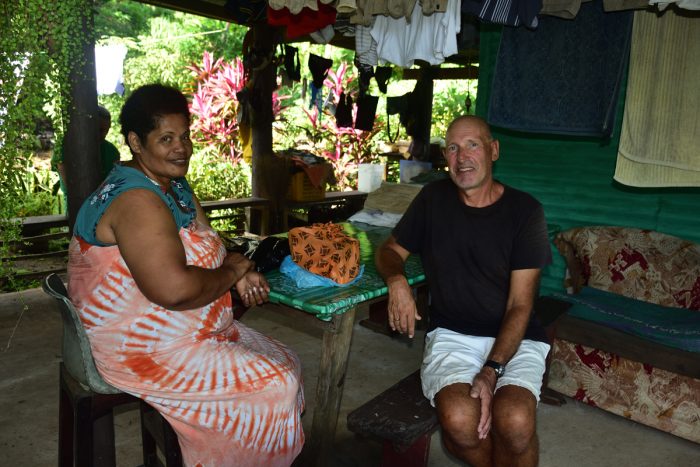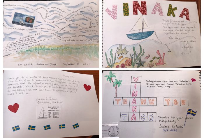 Det här är ändå en smula kulturkrock. I vår del av världen bjuder man inte hem vilt främmande människor efter några minuters bekantskap. Men vi har förstått att det är djupt rotat i den fijianska kulturen att hälsa alla främlingar välkomna, och de verkar även genuint nyfikna på vilka vi är. Vi har funderat en del under eftermiddagen, över om vi ska ta med oss något och vad ska vi ha på oss. När vi väl anländer är vi hela och rena men har inga gåvor med oss. Vi slår oss ner på golvet på verandan och allt känns avslappnat och trevligt. Kavan är redan tillredd, den malda roten är uppblött och urkramad i vatten och runt den stora skålen med brungrått vatten sitter även andra familjemedlemmar och väntar på oss. ”Bula” säger Sia, klappar hårt i händerna och överräcker skålen med kava. Man bälgar därefter i sig allt på en gång, räcker tillbaka skålen med båda händerna och klappar hårt tre gånger. (Inga små lätta golfklappar, utan med kupade händer så att det låter ordentligt). När alla fått en skål kava samtalar vi en stund, om internet, klimatförändringar och fladdermöss, snart säger Sia ”Bula” igen och klappar med händerna och det blir en ny runda med kava. Det sägs att kavan har en lugnande effekt och i vissa fall kan man känna att tungan och läpparna domnar bort. Det enda som domnar bort är benen, efter en timma på golvet och några ytterligare rundor kava, knakar det i våra leder. ”När helst ni vill åka hem så följer vi med med och lyser med ficklampan”, säger Sia. Det känns som en utmärkt stickreplik. Vi bryter upp och tackar för en trevlig afton. När vi går får vi varsin stor påse med grönsaker. Pumpa, bönor och auberginer. Vinaka very much, säger vi och vinkar till alla på verandan. Vi får även med oss en gästbok för besökande båtar att fylla i, en tradition som sträcker sig 25 år bakåt i tiden. Många sidor i boken är kreativa och konstnärliga, och glädjen över Sia och hennes familjs gästfrihet är ett genomgående inslag.