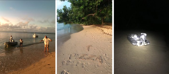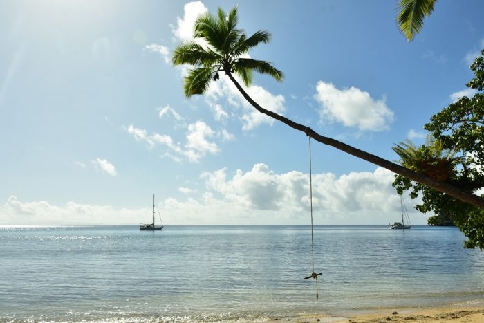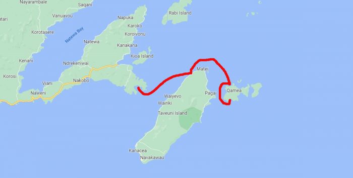 Vi lämnar Viani bay och styr norr ut genom Somosomosundet där vi passerar den 180:e longituden vilket gör att vi är tillbaka på västra halvklotet. Allt känns dock som vanligt. Vi slår följe med kamraterna på Bliss och tar sikte på en ankring på ön Taveunis norra udde, “det kan vara rulligt” står det i beskrivningen. Det är väldigt rulligt, och vi beslutar att endast stanna över natten. Vi hinner dock med att besöka en pizzeria med fin utsikt över solnedgången och havet. Den här kvällen är det “lovo-afton” vilket kräver kockens fulla uppmärksamhet, så vi som bespetsat oss på pizza väntar tålmodigt på vår tur. När pizzan väl anländer och blir uppäten kvalar den inte direkt in på någon kulinarisk topplista, men kvällen är trevlig och ölen är kall. När det är dags att åka tillbaka till båtarna är lågvattnet väldigt lågt. Cillan och Jockes jolle som vi liftat med ligger långt uppe på stranden. Jollen är stor och tung, men vi lyckas i alla fall baxa ner den i vattnet. Nästa utmaning är att i mörkret snirkla oss ut på djupt vatten utan att krascha in i några koraller. Vi lyser med ficklampan, paddlar en bit och får till sist kliva ur och vada ut på djupare vatten, innan det går att åka vidare mot de ankrade båtarna.