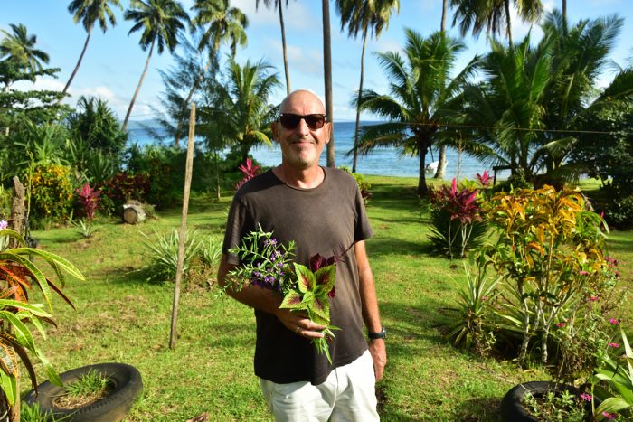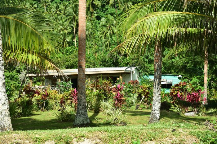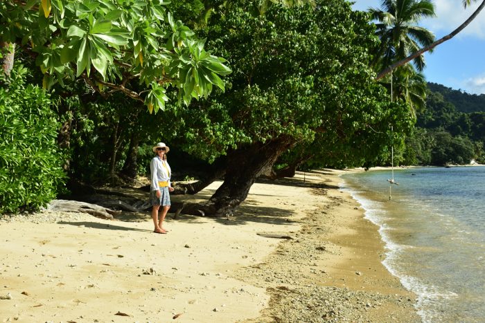 Nästa morgon drar vi upp ankaret och åker vidare. Vi rundar Taveuni och går i två timmar för motor i den lätta vinden till ön Qamena, vilket såklart inte uttalas med ”Q” utan mer som ”Ngamena”. I viken Namata ankrar vi intill en fin strand med palmer och höga gröna kullar. Vi tar jollen in till stranden. Bland blommande träd och buskar ligger några hus och en kvinna kommer oss till mötes. Hon heter Sia, ler stort, ropar ”Bula” och hälsar oss välkomna. Vi presenterar oss och frågar försynt om vi får ankra i viken och promenera på stranden. Det får vi, hon frågar oss om vi vill komma på eftermiddagen och dricka kava. Det vill vi. Vi går en promenad på stranden innan vi åker hem och gör oss i ordning.