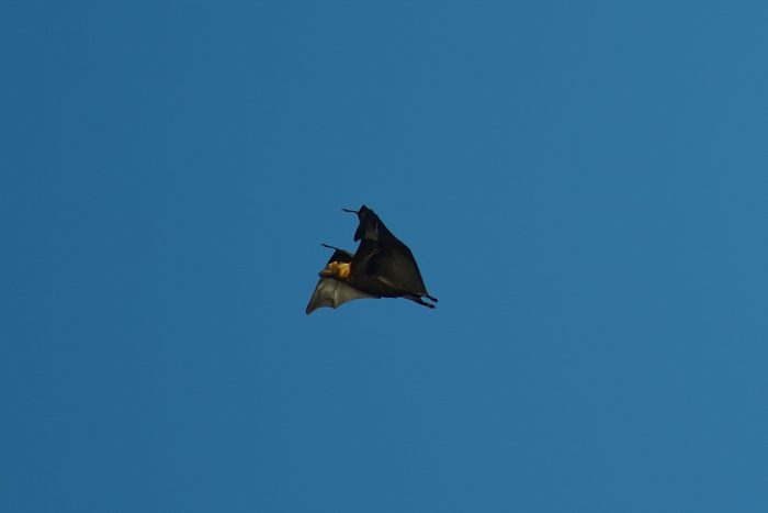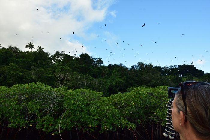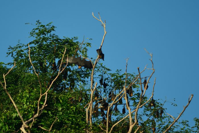 Om eftermiddagarna tar vi jollen till ön mitt i viken och spanar in de flygande hundarna. De hänger upp och ned i träden, tjattrar och tar sig då och då en flygtur.