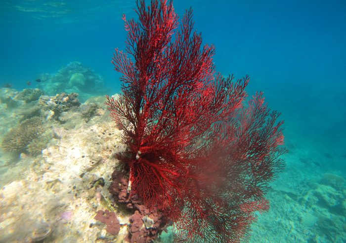 Det visar sig att Viani Bay har ett eget vädersystem. Båtar som kommer från andra intilliggande öar berättar om gropig sjö och blåst. Efter det första dygnet med sydlig vind, har vi inget annat än vindstilla och möjligen lite lätt nordlig vind som drar ner från berget. Efter åren i Franska Polynesien där det alltid finns ett intilliggande dånande och brusande rev känns det tyst här. Och svalt. På nätterna faller temperaturen till 24 grader vilket känns skönt när det är läggdags. Svalt är det också i vattnet. När vi snorklade runt på Moorea var det 30 grader i vattnet. Här är det 27, vilket kan låta som en liten temperaturskillnad, men efter en timmas snorkling är vi blåfrusna. Eftersom vi inte är helt återställda från förkylningen är det inte läge att dyka ännu. Det känns som att mitt huvud ska explodera när jag simmar ner under ytan. I väntan på att att bihålan i pannan ska tillfriskna är snorklingen på reven runt om i viken ett bra tidsfördriv. Vi ser blåa sjöstjärnor, färgglada koraller och fiskar vi inte sett förut.