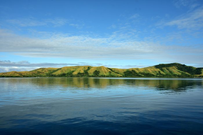 Vid första anblicken är viken påfallande lik ön Taravai i Gambier, Franska Polynesien med kullar täckta av högt gräs som stupar rakt ner i havet. Det lurar oss att tro att ankringen ska vara likadan, med rejäl sandbotten som ankaret omedelbart biter fast i. Här skramlar det när ankaret når botten och förvisso fastnar det, men det är definitivt inte sand. Det ligger fyra fem andra båtar utspridda i den stora viken och på en av dem finns vännerna Bob and Anne på Baloo. Det talar lyriskt om dykningen det gjort ute på Rainbow Reef, vilket vi också vill prova på.